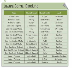 Pameran dan kontes itu berbarengan dengan peresmian cabang baru PPBI Bandung Barat. “Kontes kali ini memperebutkan piala bergilir Bupati Bandung Barat dan diagendakan menjadi acara rutin tahunan,” kata Bambang. Total 337 bonsai meramaikan acara. Peserta datang dari Bandung, Tasikmalaya, Karawang, Depok, Bekasi, Tangerang, dan Wonosobo. Pembagian kelas terdiri dari regional 138 pohon, kelas madya 43 pohon, kelas utama 20 pohon, dan kelas prospek 136 pohon.