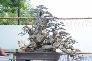 Atep juga merangsang pembungaan dengan mengurangi penyiraman. “Jika ingin bonsai mustam berbuah jangan setiap hari disiram atau volume penyiraman dikurangi agar merangsang tanaman berbuah,” katanya. Bonsai lain yang juga mencuri perhatian adalah serut Streblus asper milik pehobi asal Kabupaten Wonosobo, Jawa Tengah, Imam Santoso. Menurut Andreas, bonsai berukuran jumbo itu terlihat berumur tua.