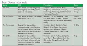 Sementara tipe migrasi salmon termasuk anadromous yaitu migrasi ikan yang kecil dan besar di laut, tapi memijah di perairan tawar. Lebih lanjut ia menuturkan ada empat ikan Tor di Indonesia yakni Tor soro, T. tambroides, T. douronensis, dan T. tambra. Keempatnya dibedakan berdasarkan keberadaan dan ukuran cuping bibir bawah (Lihat Tabel Ikan Dewa Indonesia).