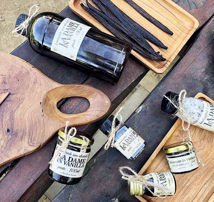 Mengolah polong vanili menjadi beragam produk seperti pasta, garam laut vanila, dan gula vanila untuk mengisi pasar ekspor serta domestik.