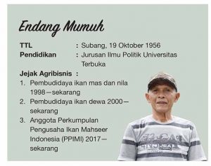 “Saya tertarik memelihara ikan dewa karena banyak orang yang mencari ikan itu,” kata peternak sejak 2000 itu. Oleh karena itulah, Endang membeli benih ikan kancra—sebutan lain ikan dewa—di peternak pada 2000 dan berlanjut hingga kini. Masyarakat Kabupaten Sumedang turun-temurun membudidayakan ikan dewa di kolam. Endang membesarkan ikan dewa berbobot 200 g hingga mencapai minimal 1 kilogram.