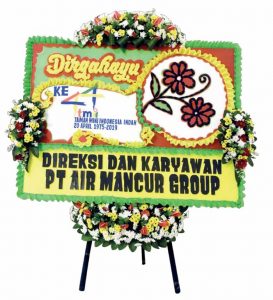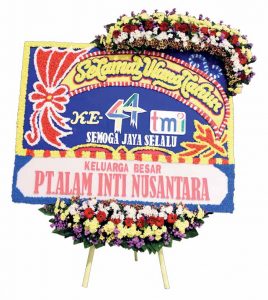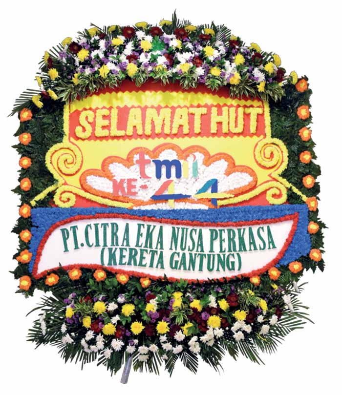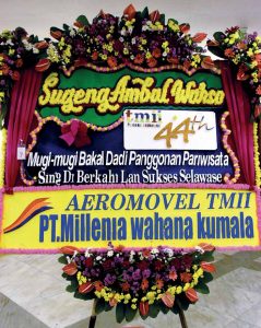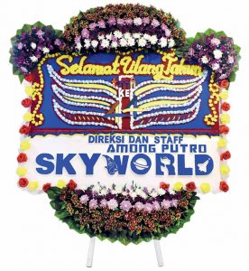 Trubus — Karangan bunga berukuran 1,5 m x 2 m itu menarik perhatian. Warna langit tampak mendominasi rangkaian. Deretan kalimat ucapan selamat ulang tahun jelas terbaca. Begitu pula dengan nama sang pengirim. Penampilan rangkaian kian indah sebab mengangkat tema kedirgantaraan selaras dengan latar belakang pengirim. Lihat saja pada bagian tengah papan terdapat pola berbentuk bentangan sayap.