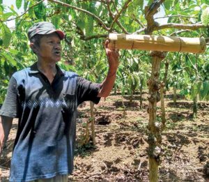 Pendapatan lain dari penjualan bibit kopi. Karsi membibitkan 500 batang kopi per tahun yang ia jual seharga Rp5.000 per batang, setara Rp2,5-juta per tahun. Klanceng dalam bumbung bambu yang ia gantung di dahan-dahan pohon menghasilkan 20 liter madu yang ia jual seharga Rp50.000 per liter, memberikan penghasilan Rp1-juta setahun. Cukup? Belum. Di sela tanaman ia menanam jahe yang per tahun ia bisa mendapat 250 kg.