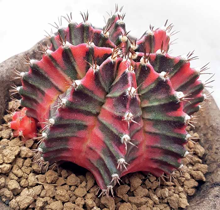 Trubus — Mutasi membuat sekujur tanaman Gymnocalysium mihanovichii tertutup warna-warni nan indah. Yang paling fenomenal adalah mihanovichii bertubuh mungil dalam balutan warna merah, kuning, dan hijau gelap. Warna merah berkumpul di bagian atas tanaman, sedangkan warna kuning mendominasi bagian tengah hingga bawah. Sekilas jika dipandang dari atas sosok tanaman mirip puding.