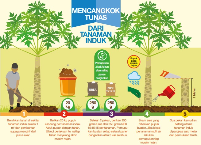 Mencangkok pepaya? Ya, mencangkok pepaya sebetulnya bukan teknik baru. Namun, belum ada yang menggunakan metode itu dalam skala luas. Harap mafhum, mencangkok pepaya membutuhkan tahapan kerja ekstra sehingga tampak rumit dan menghendaki biaya.