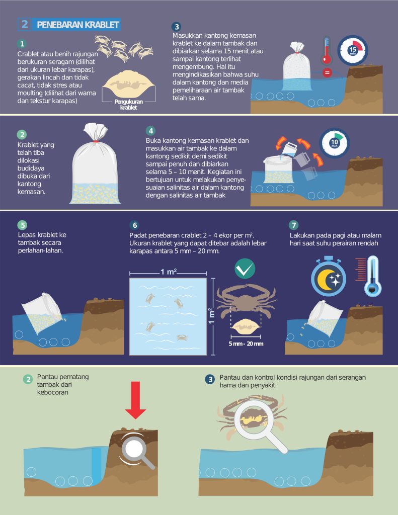 Periset di BBPBAP Jepara, Bayu Romadhona, S.Pi., M.Si., menyarankan peternak memilih krabletkrablet berukuran seragam— panjang karapas 5 mm hingga 20 mm—demi menghindari kanibalisme, gerakan lincah, berkaki utuh, dan tidak sedang moulting.