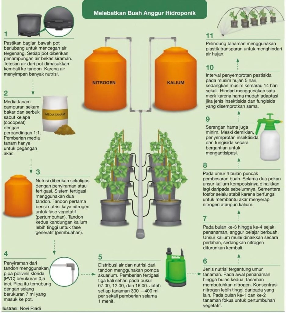 Pada umur 2 tahun, ia menuai rata-rata 30 kg per tanaman dalam setahun. Perawatan intensif kunci membuat tanaman berbuah terus menerus. Frekuensi berbuah dua kali setahun. Puluhan tanaman itu berbuah tidak bersamaan. Berikut langkah hidroponik anggur.