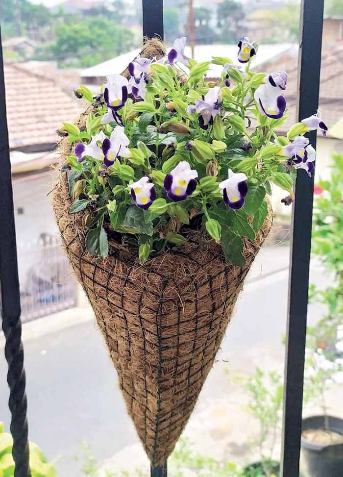 Trubus — Torenia itu tampil aduhai. Bunga-bunganya yang putih ungu menyembul dari sebuah pot berbentuk kerucut cokelat terang. Sepintas penampilannya mirip buket atau bunga tangan. Pot unik itu terbuat dari limbah produsen sapu rumahan. “Limbah sabut kelapa itu biasanya hanya jadi bahan bakar membuat batu bata dan genteng,” ujar Sumardiono yang tergerak memanfaatkannya sebagai pot.