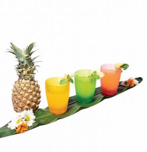 Gelas wadah minuman sekaligus pencuci mulut. Gelas berwarna kuning bercita rasa buah jeruk, warna hijau (teh hijau), dan merah (buah leci). (Dok. Evoware)