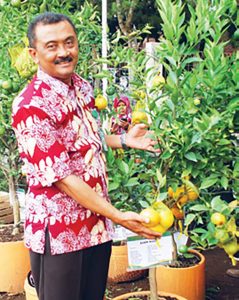 Puluhan pohon jeruk itu berbuah lebat. Buah kuning cerah amat kontras di antara hijau daun. Pohon anggota famili Rutaceae itu tumbuh di pot tanah liat berdiameter 60 cm. Adapun tinggi pot hanya sekitar selutut orang dewasa. Beragam jenis jeruk di antaranya montaji agrihorti, kalamondin, siam pontianak, dan keprok batu 55 itu berbuah berbarengan. Tabulampot jeruk itu memeriahkan acara Spektahorti 2018 pada 20—23 September 2018.