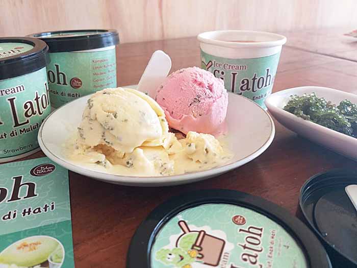Pasokan lawi-lawi—sebutan anggur laut di Sulawesi Selatan—berasal dari perairan di Kecamatan Paciran, Kabupaten Lamongan, Jawa Timur. Kegiatan ekstrakurikuler kewirausahaan SMA Mazra’atul Ulum—produsen Si Latoh—menjalin kerja sama dengan para petani anggur laut di daerah itu. “Kami tidak lagi mencari anggur luat sendiri di laut,” kata Putri. Lebih lanjut ia menuturkan kandungan anggur laut dalam es krim mencapai 10%. Selain potongan, Putri dan Eva pun mencampur jus anggur laut dengan adonan es krim.
