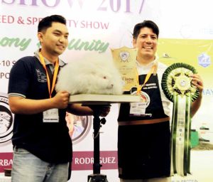 Yohanes Hermanto (kiri) dan juri kontes kelinci asal Amerika, Scott Rodriguez saat menerima penghargaan best in show. (Dok. Sugita Yohanes Hermanto