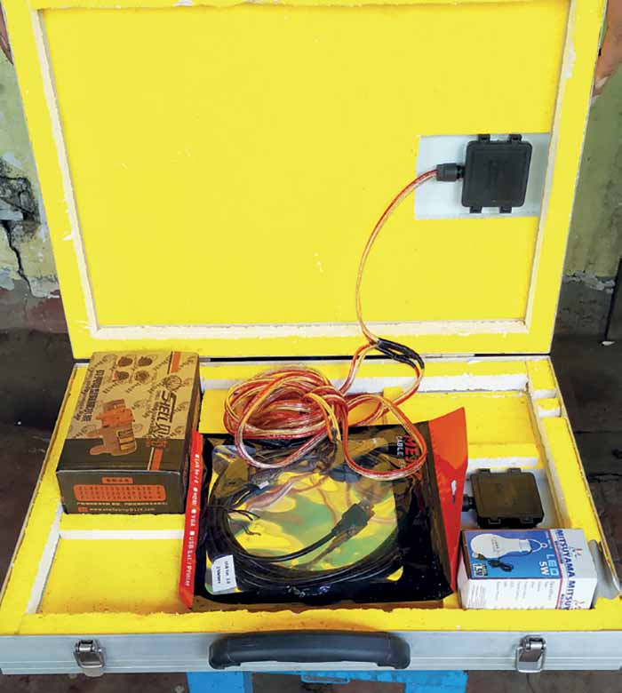 - Di dalam koper panel surya terdapat peralatan tambahan berupa pompa, regulator, akumulator, dan kabel yang terhubung.