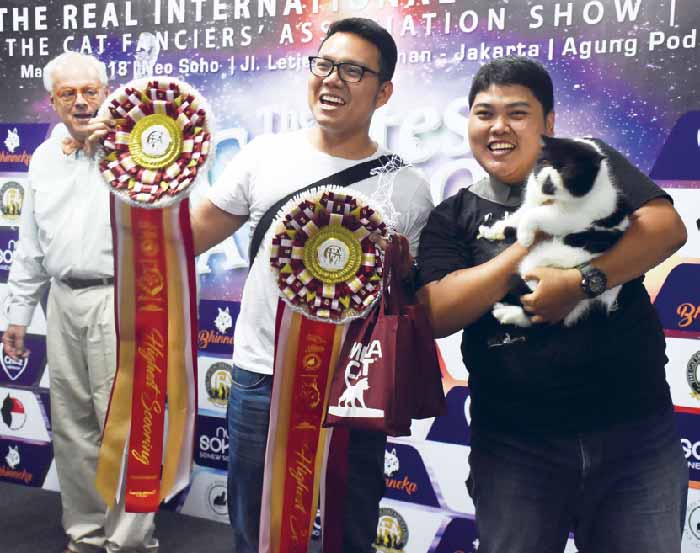 Juri asal Jepang, Edward Maeda (kiri) bersama Ray Mananggar dan kucing ras persia Hurayra Naeemah.