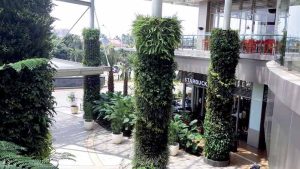 “Itu sengaja, tadinya ingin dengan lafaz Muhammad, tapi tidak memungkinkan karena sulit,” jelas Harun. Ketika memasuki lobi utama Bintaro Jaya Xchange Mall, Kota Tangerang, Provinsi Banten, pengunjung pun dimanjakan dedaunan hijau yang menempel di permukaan dinding pusat perbelanjaan itu. Taman dinding itu dibuat pada akhir 2012. Di taman dinding seluas 2.100 m² terdiri dari 140.000 tanaman. (Tiffani Dias Anggraeni)