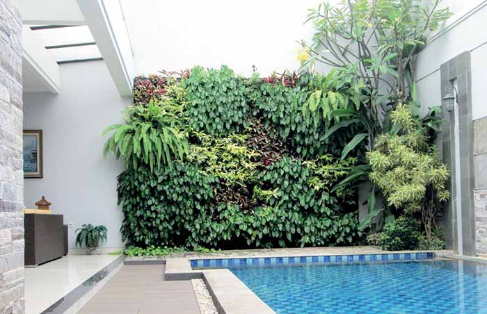 Trubus — Hezty Azzahrah di Kabupaten Jombang, Jawa Timur, senang menghabiskan waktu di halaman belakang rumah. Di sana ia biasa berenang sembari memandang taman dinding berukuran 15 m x 2,5 m. “Rasanya seperti berenang di alam,” katanya. Sudah empat tahun ia menikmati keindahan lili paris, begonia, philodendron, calathea, dan kadaka di dinding yang berpadu cantik dan tetap prima tampilannya.