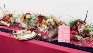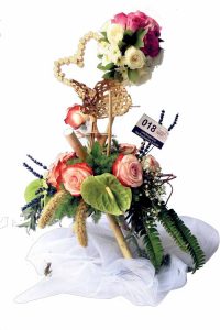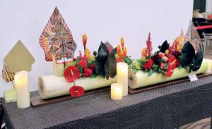 Yang menarik, Aldi memanfaatkan batang pisang sebagai media untuk menancapkan flora. “Batang pisang lazim digunakan untuk media penancapan wayang kulit selama pagelaran berlangsung,” katanya. Buket buatan Aldi juga tampil cantik. Penampilannya selaras dengan rangkaian meja makan yang dibuat. Begitu pula dengan boutonniere yang dibuat sesuai dengan kriteria yang ditentukan juri.