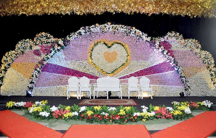Trubus — Usai Idul Adha lazimnya banyak pasangan melangsungkan pernikahan. Masyarakat percaya itu bulan baik untuk berjanji sehidup semati. Enang Suryana dan rekan memberikan inspirasi desain pelaminan yang tak biasa. Tinggi pelaminan 4,5 m dan panjang 14 m tampak megah. Penampilannya indah berhiaskan 24.000 kuntum mawar berwarna putih, merah muda, dan kuning. Setiap kuntum tersusun apik dan rapi.