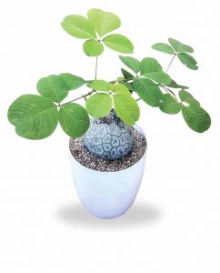 Tanaman di pot keramik putih itu bak magnet yang menarik perhatian. Batang tanaman menggelembung serupa bola. Kulit batangnya membentuk corak persegi tidak beraturan berwarna putih keabuan dan bertekstur halus. Dari ujung tanaman muncul dedaunan berbentuk elips. Itulah Bombax ellipticum bersinonim dengan Pseudobombax ellipticum.