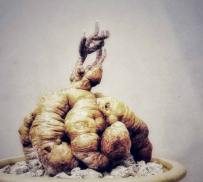 Itulah sebabnya tanaman anggota keluarga Malvaceae itu cocok sebagai peneduh. Batang tanaman berwarna hijau keabuan dan menggembung. Diameter batang bisa membesar hingga 1,3 m. Sugita juga mengoleksi tanaman berbonggol lain yang istimewa yakni Dioscorea elephantipes. Para pehobi menyebut tanaman itu elephant foot alias kaki gajah. Julukan kaki gajah disematkan lantaran batang tanaman besar mirip kaki gajah.