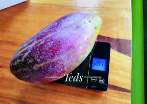 Beberapa buah di antaranya bahkan berukuran jumbo. Pada musim berbuah sebelumnya, rekor buah terbesar mencapai 2,4 kg per buah. “Itu buah tunggal. Dalam satu dompolan hanya tersisa satu buah,” tutur Teddy. Ia mendatangkan red ivory pada 2013 dari Thailand. Pebisnis bibit buah itu tertarik berburu red ivory saat memperoleh informasi tentang keistimewaan mangga itu di Negeri Gajah Putih.
