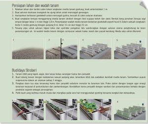 Isinya 3 rangkaian media stroberi sistem gantung berbahan talang sepanjang 5 m beririgasi tetes. Namun, pada bulan ke-3, muncul masalah. Hama tungau Tetranychus sp. atau spider mite menyerang bagian bawah daunmenyebabkan daun kering.