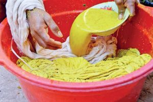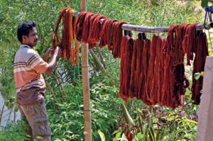 Para perajin menumbuk akar mengkudu, menambahkan kulit dan daun loba Symplocos fasciculate. Pekerjaan memerahkan tenun itu disebut kombu, sedangkan perempuan yang melakukannya disebut dengan makombu. Mereka meletakkan ramuan warna merah ke dalam wadah. Yang menarik pewarnaan merah masih ada proses sebelum mencelup warna yang disebut dengan perminyakan.