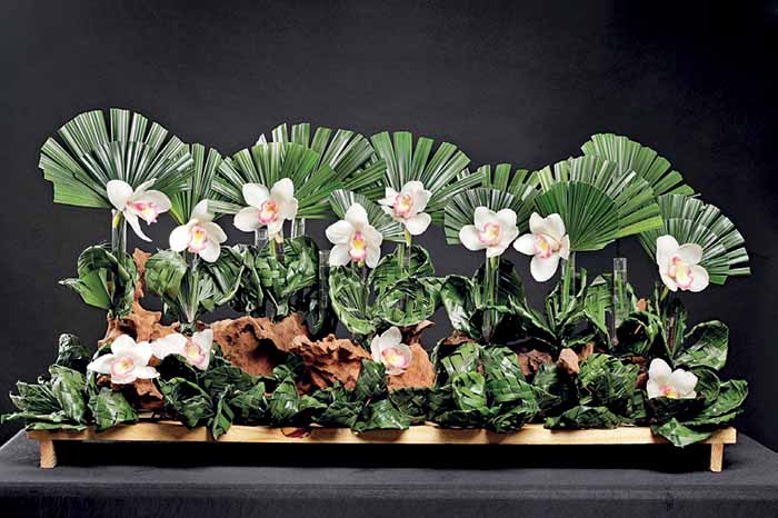 Pada rangkaian bertema “Wonderful Raphis excelsa” itu Winny menyematkan 12 kuntum anggrek cymbidium putih. Setiap tangkai anggrek mengisi tube kaca berisi air agar senantiasa segar. Warna anggrek yang kontras dengan palem membuat penampilan rangkaian kian menarik. Winny memanfaatkan aksesori berupa fosil kayu berwarna cokelat untuk menyempurnakan rangkaian.